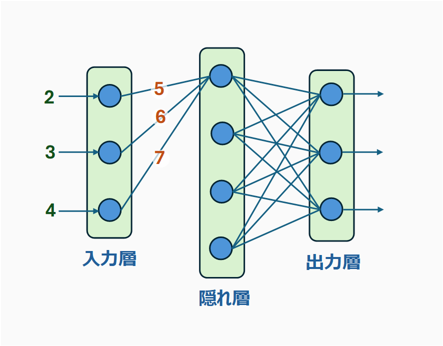 入力層には2、3、4という数値が入ってきて、各線には、5、6、7という重みが設定されています。