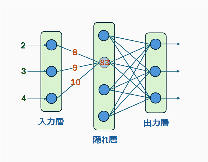 鈴木:入力層から入った、2、3、4という値が、隠れ層に到達したとき、56になったということですね。
