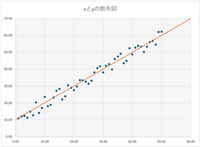 続いて、最小二乗法による計算から、aとbを求めます。計算は省きますが、 a = 1、 b = 10 という結果が出たとしましょう。これにより、このデータは、全体として y = x + 10 という傾向があることが突き止められたわけです。この一次方程式を、オレンジ色の線で描画してみます。
